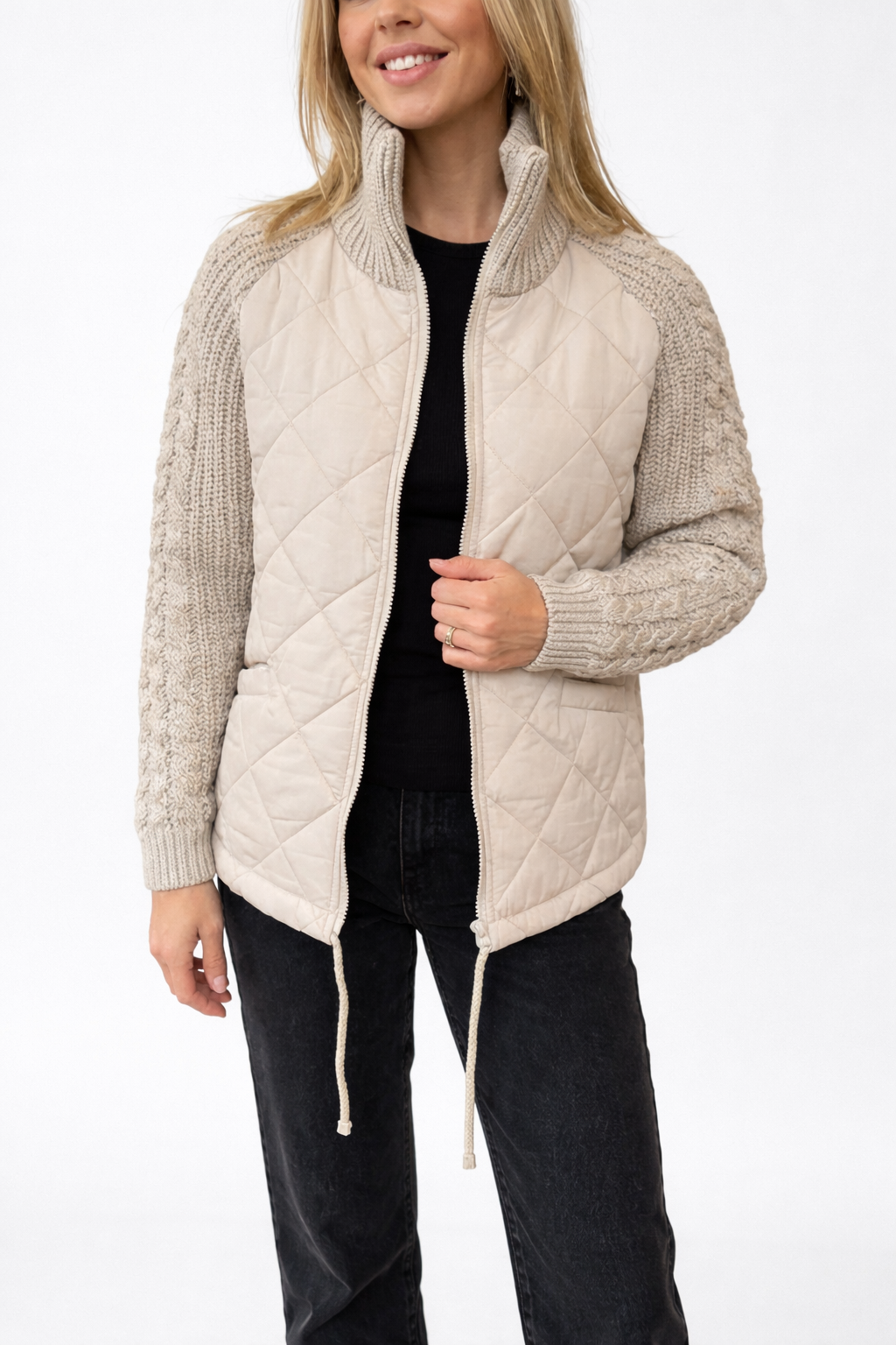 En raffinert og komfortabel jakke som kombinerer et quiltet design med myke strikkede detaljer – perfekt for kjølige dager hvor stil og funksjonalitet går hånd i hånd. Jakken har en lett polstret front som gir behagelig varme, mens de strikkede ermene og kragen sørger for en avslappet og flatterende passform. Et ideelt valg for deg som er på jakt etter en allsidig jakke til hverdagsbruk.