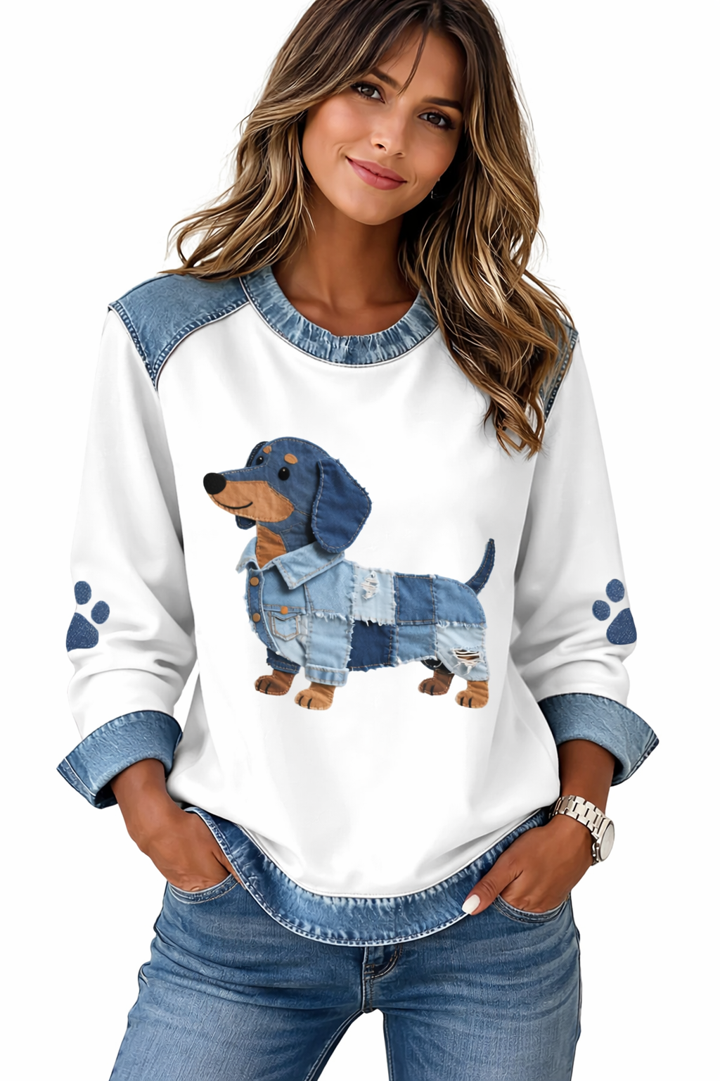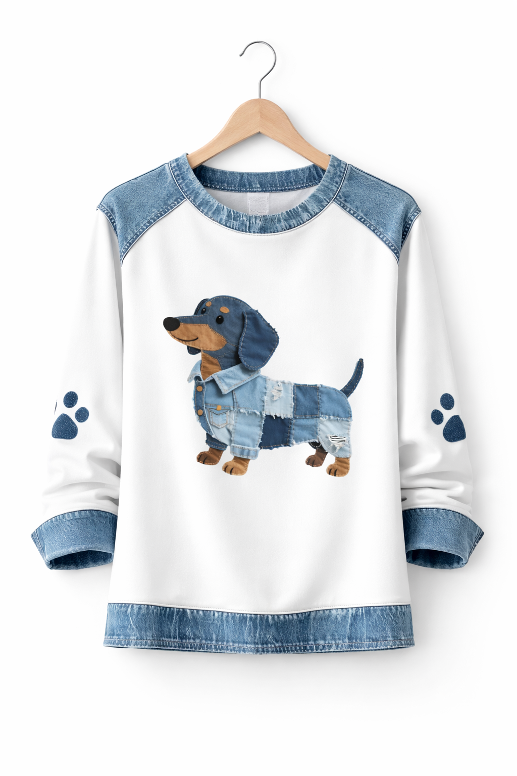 ü  Iøynefallende trykk – leken dachshund med denimdetaljer som blikkfang